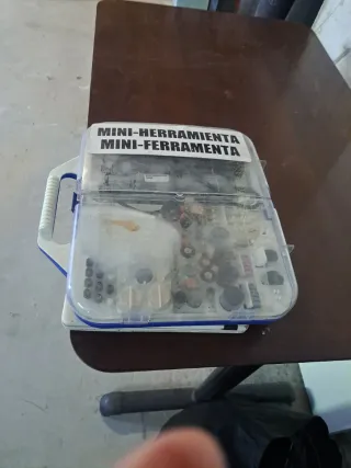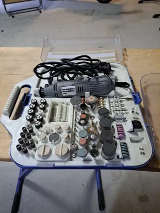 Mini herramienta rotatoria de 135W, ideal para trabajos de precisión y bricolaje. Viene con un completo set de accesorios para diversas tareas. ( LE FALTAN ALGUNAS PIEZAS) - Incluye mini herramienta rotatoria. - Amplia variedad de accesorios para lijar, pulir, cortar y grabar. - Estuche organizador para guardar todo. - Cable de alimentación.
