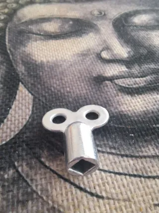 Llave metálica para purgar radiadores. - Material: Metal plateado. - Diseño en forma de 8 con vástago. - Tiene un ancho total aproximado de 24 mm, una altura de 26'2 mm y cuenta con un orificio cuadrado interior de 5 mm. - Se utiliza para extraer el aire acumulado en el interior de los radiadores. - Ayuda a mejorar la eficiencia de la calefacción, reducir el ruido y asegurar una emisión de calor uniforme. - Nuevo a estrenar.