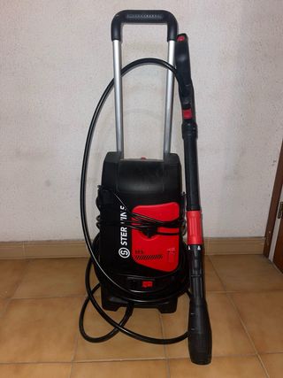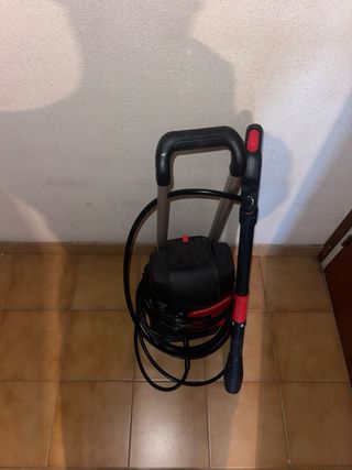 Hidrolimpiadora Karcher modelo ST3 en color negro y rojo. Incluye manguera y lanza. - Diseño compacto y portátil. - Ruedas para facilitar el transporte. - Asa extensible.