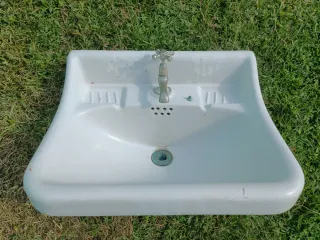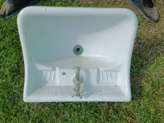 Pica antigua de cerámica blanca, ideal para proyectos de restauración o decoración rústica. - Diseño clásico con dos jaboneras laterales. - Grifería de latón con acabado envejecido. - Agujero para grifo central.