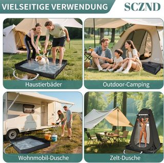 Nuevo, sin abrir. Base de ducha portátil y plegable, fácil de montar y desmontar. - 104 x 104 x 13 cm - Diseñada para adaptarse a la mayoría de las tiendas de ducha exteriores. - Diseño cuadrado. - Incluye manguera de drenaje y abrazadera.