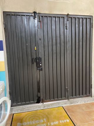 Puerta metálica de garaje, ideal para entradas de vehículos o espacios amplios. - Fabricada en metal resistente. - Diseño de lamas verticales. 2m10cm de alto 2m 10cm de ancho
