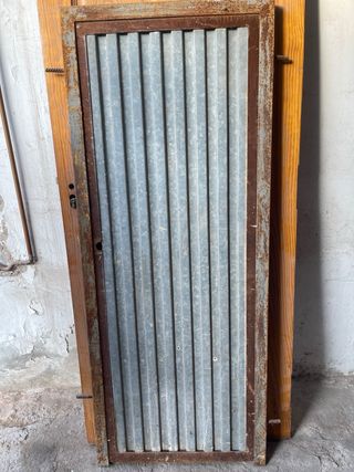 Puerta metálica con acabado industrial, ideal para exteriores o espacios de trabajo. - Estructura de metal resistente. - Panelado de chapa acanalada. - Marco y bisagras de metal.