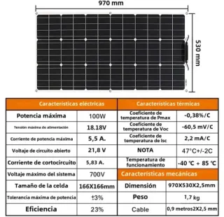 Panel solar flexible de 100W con unas dimensiones de 970x530mm Panel solar flexible de 100W, completamente nueva! Dispongo de 2 unidades en sus cajas. Yo he instalado dos en mi furgoneta y van perfectas. Flexible y portátil. 12v 100W de potencia Se pueden recoger en persona o hacer envíos. 75€ una o 150€ las dos