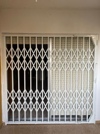 Reja de seguridad corredera de color blanco, ideal para proteger accesos. - Diseño de tijera. - Estructura metálica. - Medidas 2x2’05