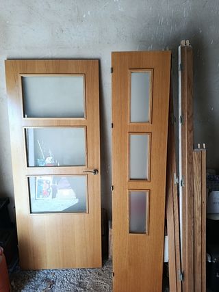 Doble puerta comedor acristalada. Color roble claro. En perfecto estado. Se venden tras reforma donde ya no se vuelven a colocar . Marcos y pre marcos incluidos
