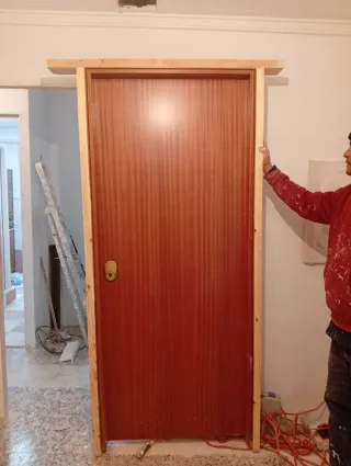 Puerta de entrada acorazada con acabado en madera. - Marco de madera incluido. - Bisagras visibles. - Cerradura dorada.