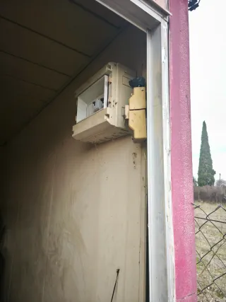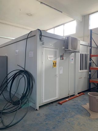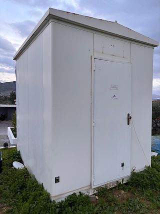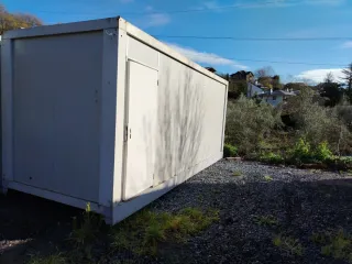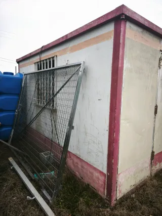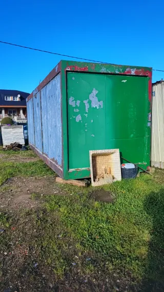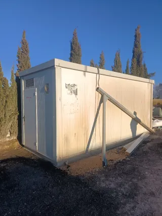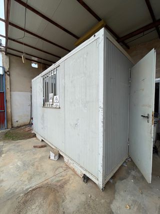 Caseta prefabricada metálica tipo oficina obra.huerto almacén container módulo Medidas exteriores aprox. 3,70 x 2,40 x 2,45 m. Estructura de acero con panel sándwich, puerta metálica e instalación eléctrica básica (luz y enchufes). Estado usado. Exterior con óxido en la parte baja y pintura deteriorada. Interior funcional. Ideal como almacén, cuarto de herramientas, finca u obra. Peso aprox. 1.300 kg. Carga y transporte a cargo del comprador. Hashtags: #casetaobra #moduloprefabricado #casetametalica #almacen