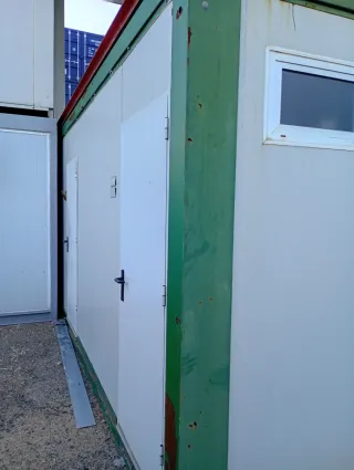 Módulo obra 6 metros cinco inodoros dentro con lavabo más un aseo con puerta de exterior independiente Posibilidad de transporte precio no incluido Caseta sanitaria prefabricada, ideal para obras o eventos. - Estructura metálica. - Dos puertas de acceso. - Color blanco.