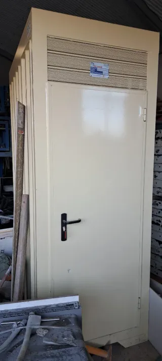 Caseta de obra prefabricada, lista para instalar. Ideal para baños temporales o instalaciones en obras. - Estructura metálica resistente. - Puerta con manilla y cerradura. - Rejilla de ventilación superior.