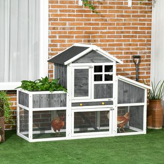 GALLINERO MULTIFUNCIONAL: Caseta elevada para gallinas con nido separado y zona abierta cercada, ideal para 3 gallinas. Incluye un jardín para plantas. ESTRUCTURA SÓLIDA: Hecho de madera de abeto con techo de asfalto, resistente al agua. DIMENSIONES: 161.5L x 62.5P x 115A cm; caseta: 62.5L x 54P x 72.5A cm. FÁCIL ACCESO: Rampa interna y puertas con bloqueo para seguridad. FÁCIL DE LIMPIAR: Bandeja extraíble para una limpieza sencilla. Seguro y no tóxico, diseñado para resistir el uso exterior. Montaje requerido. Color: Gris. Adecuado para mascotas, ofrece comodidad y practicidad.