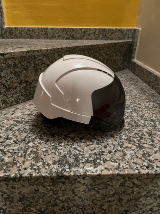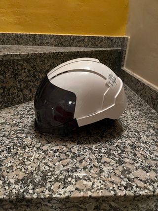 Casco de seguridad con visera retráctil Casco totalmente nuevo, incluye asas para atar El caso está un poco desgastado en la parte de la nariz de la visera (Se ve en la penúltima foto) Por lo demás está totalmente nuevo y nunca se ha usado. Este defecto en la parte desgastada la goma de la nariz no afecta para nada a su uso
