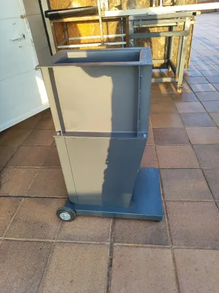 Bancada metálica de color gris, diseñada para taladro o sierra de cinta. Cuenta con ruedas para facilitar su movilidad. - Estructura robusta de metal. - Base estable. - Ruedas para transporte.