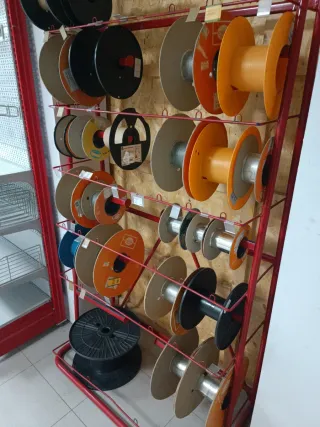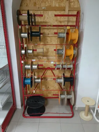 Expositor metálico de color rojo para organizar y almacenar rollos de cable. - Estructura robusta. - Múltiples niveles para diferentes tamaños de bobinas. - Ideal para talleres o almacenes.