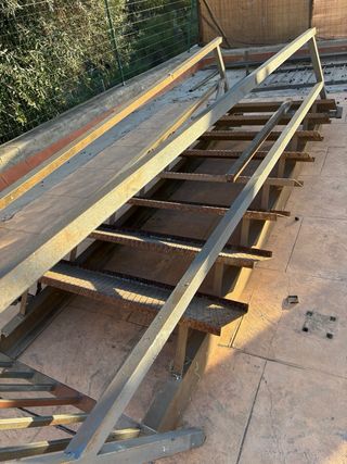 Escalera metálica de exterior, ideal para acceder a diferentes niveles. - Construcción robusta de metal. - Peldaños con superficie antideslizante. - Pasamanos integrado para mayor seguridad. Medidas: ancho escalón 1 metro largo escalera 3 metros