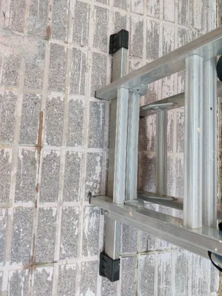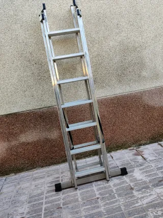 Escalera de aluminio de tres tramos, ideal para trabajos en altura. - Fabricada en aluminio resistente. - Diseño extensible para mayor versatilidad. - Pies de goma para mayor estabilidad.