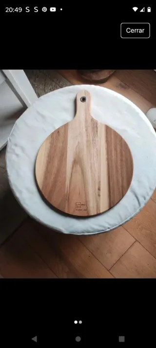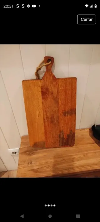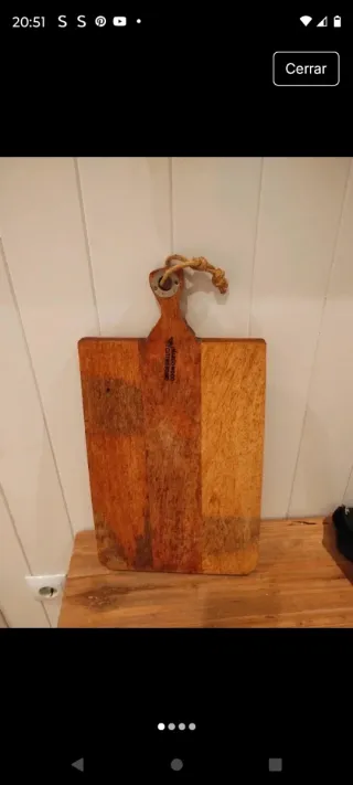 Tabla de cortar de madera de mango con un diseño rústico y un asa para colgar. - Material: Madera de mango. - Diseño bicolor. - Asa con cuerda para colgar. 48x25x2 Solo usada de adorno No envío por correos,por el peso