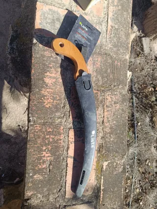 Serrucho de poda de la marca LISTA, ideal para trabajos de jardinería. - Mango de madera. - Funda protectora de plástico negro. - Hoja curva.