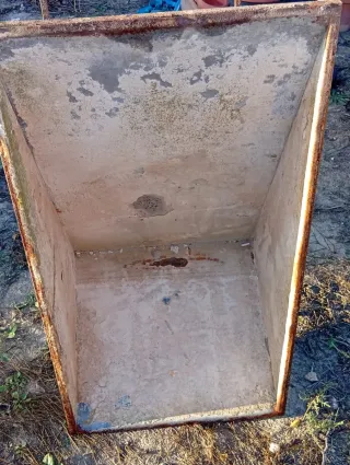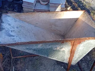 Carretilla de obra con estructura metálica y cubeta de gran capacidad. Ideal para transportar materiales de construcción o jardinería. - Cubeta de metal galvanizado. - Estructura de soporte robusta. - Bordes reforzados con óxido. Tendrías que venir a recogerla