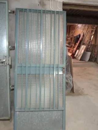Puerta de hierro con diseño acristalado. - Marco y barrotes de hierro. - Panel acristalado.