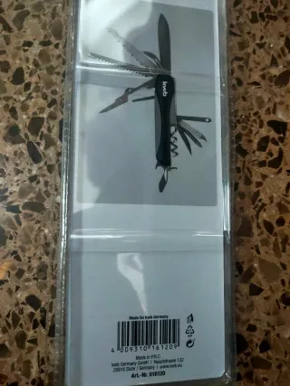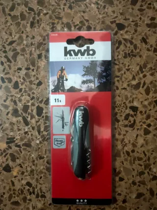 Navaja multiusos de la marca KWB con 11 funciones diferentes. Ideal para reparaciones y actividades al aire libre. - Diseño compacto y ergonómico. - Fabricada en acero inoxidable. - Incluye sacacorchos y abridor.