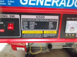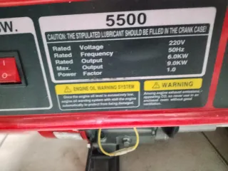 Generador eléctrico de gasolina con una potencia máxima de 5.0KW y nominal de 4.5KW. - Modelo: 5500 - Voltaje: 220V - Frecuencia: 50Hz - Factor de Potencia: 1.0 - Interruptor de encendido/apagado (ENG. SW.) - Indicador de nivel de aceite (ENGINE OIL WARNING SYSTEM) - Voltímetro (VOLT METER) - Estabilizador de Voltaje Automático (AVR)