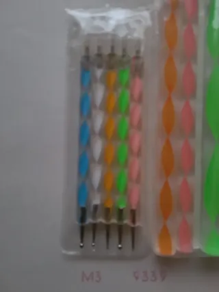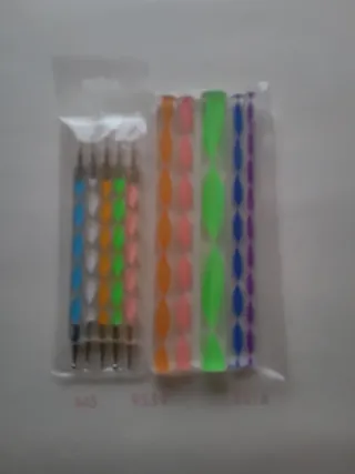 Set de herramientas para dotting, ideales para nail art y manualidades. - Incluye varios punteros con diferentes tamaños de bola. - Mango de plástico de colores variados: naranja, rosa, verde y morado.
