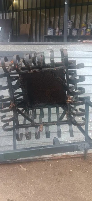 Sombrero para chimenea de metal forjado. - Diseño decorativo con volutas. - Estructura robusta.