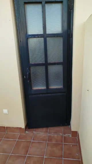 Puerta de madera maciza con detalles de cristal. - Diseño con seis paneles de cristal. - Marco de madera oscura. - Tirador metálico dorado. En Cenes de la Vega. Negociable.