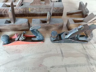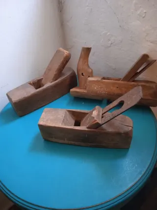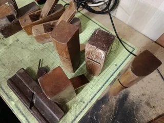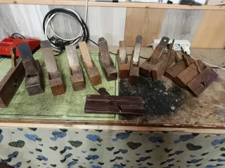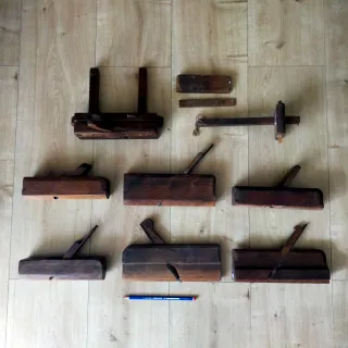 Conjunto de cepillos de carpintero antiguos, ideales para coleccionistas o para uso en trabajos de ebanistería. - Fabricados en madera. - Diseños variados para diferentes tipos de trabajo. La unidad 10€ los 13 cepillos 100€