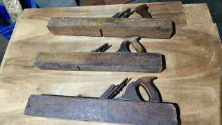 Garlopas, cepillos carpintero, herramientas carpintero, herramientas antiguas, herramientas coleccion Juego de tre garlopas antiguas de madera. Se pueden vender juntas o separadas.Ideales para carpintería o coleccionismo. La mayor tiene 63cm. No tienen carcoma. Las cuchillas son de la marca Peugeot o Goldemberg. Más herramientas en mi perfil