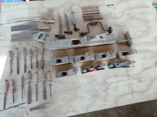 Conjunto de herramientas antiguas de carpintero, ideales para coleccionistas o aficionados. - Variedad de formones y gubias. - Cepillos de carpintero de diferentes tamaños. - Sierras manuales. - Brocas para madera. - Berbiquí.