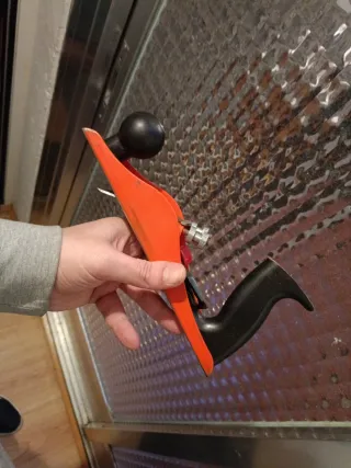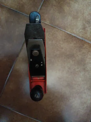Cepillo de carpintero con base y mango de color rojo y negro. - Cuerpo principal de metal rojo. - Mango curvo de metal negro.