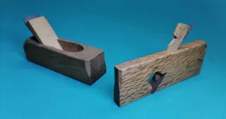 Conjunto de dos cepillos de carpintero antiguos, fabricados en madera y uno moderno en hierro. Uno de ellos con polilla - Piezas de colección para trabajos de ebanistería. - Material: Madera y metal.