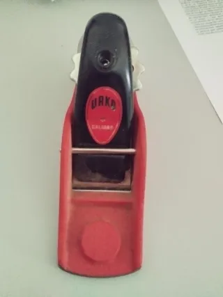 Cepillo manual de carpintero de la marca URKO. Herramienta clásica para trabajos de madera. Es antiguo pero está en buen estado - Cuerpo de metal rojo. - Mango ergonómico negro. - Cuchilla dentada. - Detalle de etiqueta roja con texto 'CALIDAD'.