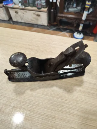 Espectacular cepillo antiguo de carpintero, perfectamente protegido con cera de anticuario. Datado en la 1a mitad del s. XX, es de doble tornillo. Completo, con su hoja, y todos sus elementos. Muy bonito, muy estético, con elementos de madera, hierro y latón. Todo el muy decorativo, tiene en un lateral, un logotipo de un castillo. Ideal para los amantes de las herramientas antiguas, para decoración tanto en bodega, mesón, etc como para colocar como sujetalibros o simple adorno en cualquier balda. Mide 19,5 cms y con el asa mide de largo 34 cms, 6 cm de ancho que sube a 16 cm si contamos los tornillos y 14 cms de alto. Pesa 2 kg