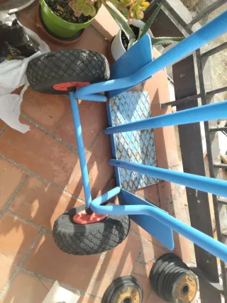 Carretilla de mano robusta, ideal para transportar objetos pesados. Su diseño plegable facilita el almacenamiento. CON RUEDA PINCHADA - Estructura principal de color azul. - Asas de color rojo para un mejor agarre. - Ruedas resistentes para facilitar el movimiento.