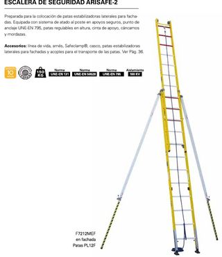 Escalera de seguridad marca Arizona, modelo Arisafe-2. Elevación por cuerda Sistema de bloqueo automático Ruedas de deslizamiento para fachadas Barras estabilizadoras laterales incluidas Anclaje para línea de vida Patas regulables en altura individualmente Se dispone de 3 unidades nuevas y varias usadas pero en buen estado. Precio en tienda con las patas estabilizadoras supera los 1000€ - Fabricada en España. - Diseño robusto y seguro.