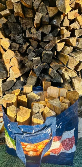 Leña de madera lista para usar vendido por bolsa. Madera seca de 4 anos cuberta. Perfecto por cheminea o estufa.