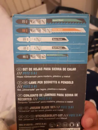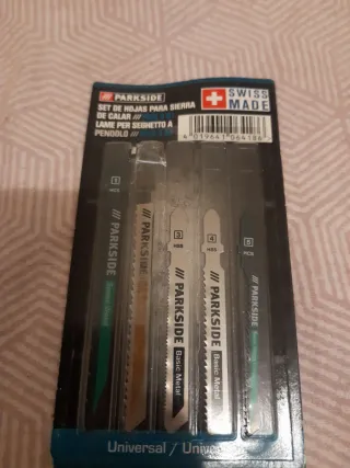 Set de 5 hojas para sierra de calar Parkside. - Incluye 2 hojas HCS para madera (1x Speed Wood, 1x Basic Wood Curve). - Incluye 3 hojas HSS para metal (2x Basic Metal, 1x Basic Metal). - Fabricado en Suiza.