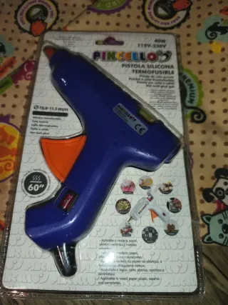 Pistola de silicona termofusible de la marca Pincello. - Potencia de 40W. - Voltaje 110V-230V. - Diámetro de la barra de silicona: 10.8-11.3 mm. - Aplicable a madera, papel, plástico, cerámica y semimetales.