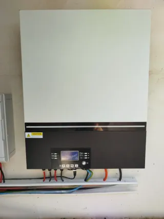 Inversor para placas solares, diseñado para sistemas fotovoltaicos. Autoconsumo. 3 años de uso, se vende por cambio a híbrido. Funciona perfectamente. Precio algo negociable. - Panel frontal con pantalla y controles. - Conexiones para cableado. - Indicador de advertencia 'CAUTION'.