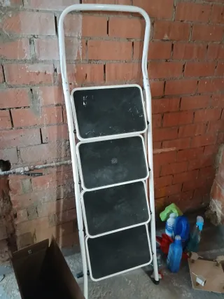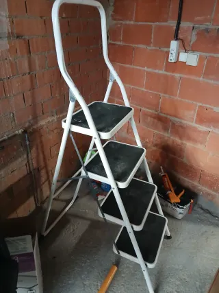 Escalera plegable de cuatro peldaños, ideal para tener en casa o para trabajos puntuales. Su diseño permite guardarla fácilmente. - Estructura metálica blanca. - Peldaños con superficie antideslizante negra. Usada muy poco