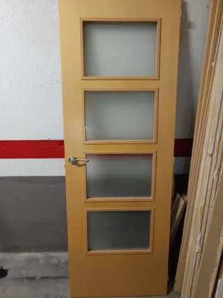 Puerta de madera maciza para interior, ideal para cocina o cualquier estancia. - Diseño con cuatro paneles de cristal opaco. - Acabado en madera clara. Tiene todos los componentes necesarios para el montaje y tornillería original.