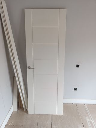 Puerta interior de diseño moderno en color blanco. Ideal para cualquier estancia del hogar. - Diseño con 5 paneles horizontales. - Acabado liso y mate. - Incluye manilla plateada. - Incluye el marco - Lista para instalar - 203x72.5 Recogida en Ciempozuelos