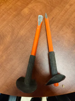 Herramientas de ferretería para trabajos de albañilería o demolición. - Cincel plano con mango naranja y negro. - Puntero con mango naranja y negro. - Cuchilla de metal.