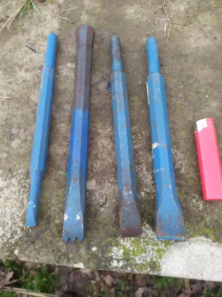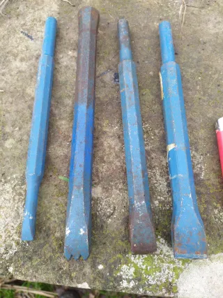 Se vende un conjunto de herramientas manuales para trabajos de albañilería o cantería. - Incluye cinceles de diferentes tamaños - También se incluye una gradina con múltiples puntas. - Las herramientas presentan un acabado azul con un poco de oxido del tiempo.