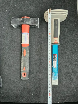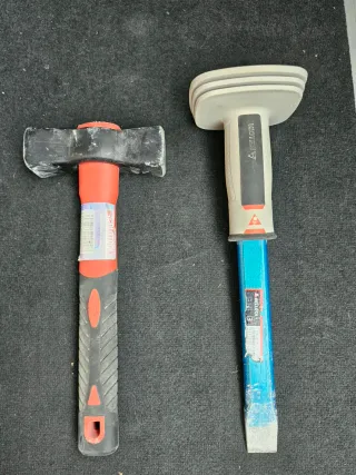 Conjunto de herramientas de albañilería Bellota. - usadas pero en muy buen estado - tienen unos 15 años, con un acero de mejor calidad que el actual. - dudas preguntar - Maceta con mango de madera. - Cincel con empuñadura protectora roja.