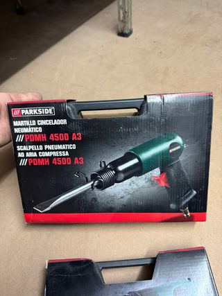 Herramienta neumática Parkside + juego de cinceles en maletín Descripción detallada: ✔️ Marca: Parkside ✔️ Herramienta neumática tipo pistola para compresor ✔️ Incluye set de cinceles (planos/angulados) ✔️ Maletín para guardar todo organizado ✔️ Botella de aceite lubricante incluida ✔️ Perfecta para trabajos de demolición ligera, albañilería y bricolaje ✔️ Estado: usado (indica si funciona bien y si probaste con compresor) ✔️ No incluye compresor ni manguera de aire (solo herramienta y accesorios)