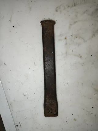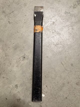 Cincel de metal para usar con martillo. Su diseño es alargado con una punta ancha y plana. - Material: Metal. - Forma: Alargada con punta ancha.